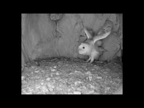 Watch how this barn owl holds its own when a tawny owl twice its size flies into the tree it is roosting in!