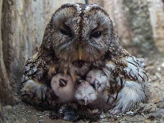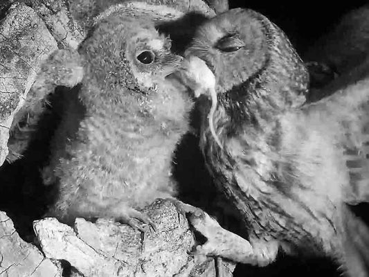 Although this pair have raised four owl families at Beech Stump, not all of the chicks were their own. When they first nested in this box, in 2021, Luna's eggs failed. They failed again in 2022. At that time I placed two rescued chicks into the nest and the pair readily accepted and fostered these chicks - even going on to accept four more in the same year. In subsequent years these owls have raised foster chicks alongside their own. It will be interesting to see how their story develops this season.