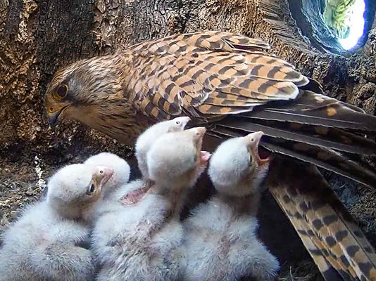 This kestrel pair are now a great team. Athena is very caring mother, and she defends the chicks fiercely and first-time dad Apollo is really stepping up to the challenge, too.