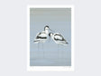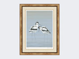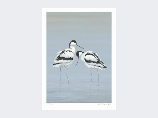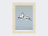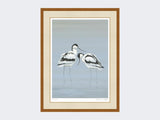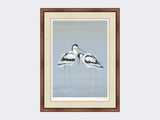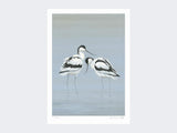 This stunning image shows a pair of avocets against a pale blue background. This painting of a pair of avocets was inspired by watching a group of these beautiful birds feeding in the shallows.