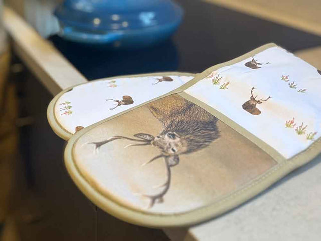 This practical gift is made in the UK and has a central hanging loop for convenience and coordinating grey piped edge. Beautiful red stag design.