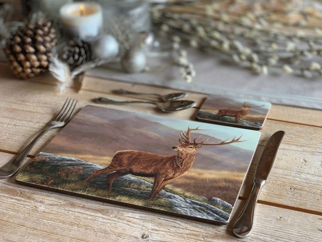Dine in style with this luxury table setting featuring a stunning image of a majestic red stag. The perfect finishing touch to your table and a stylish way to protect your table from spills and stains.