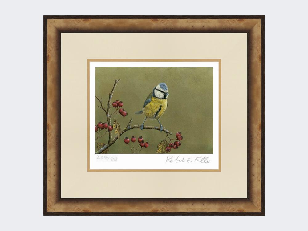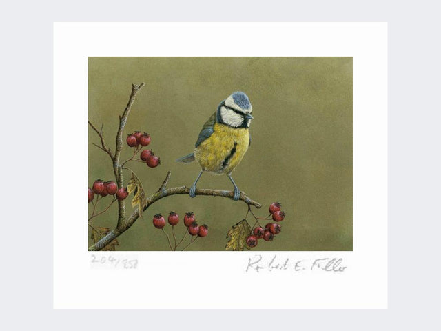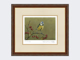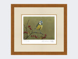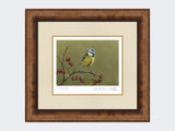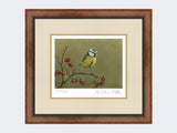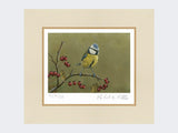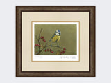 This wonderful limited edition art print shows a blue tit against a green background.