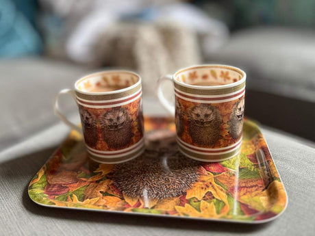 The perfect gift for robin lovers. A gorgeous melamine tray featuring a robin on hawthorn accompanied by a pair of matching fine bone china mugs featuring the same design.