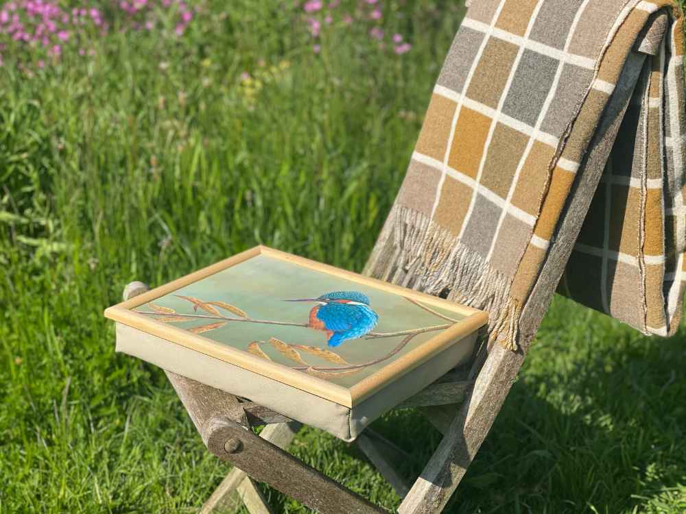 Kombinieren Sie häuslichen Komfort mit wunderschönen Kunstwerken mit diesem atemberaubenden Knietablett, das ein Gemälde von Robert E. Fuller zeigt, das einen Eisvogel zeigt, der auf einem Weidenzweig vor einem sanften grünen Hintergrund sitzt.