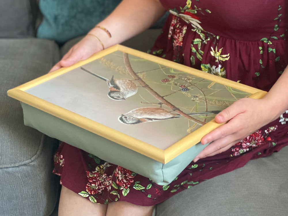 Kombinieren Sie häuslichen Komfort mit wunderschönen Kunstwerken mit diesem atemberaubenden Knietablett, das ein Gemälde von Robert E. Fuller mit einer Schwanzmeise auf Kätzchen zeigt.