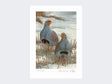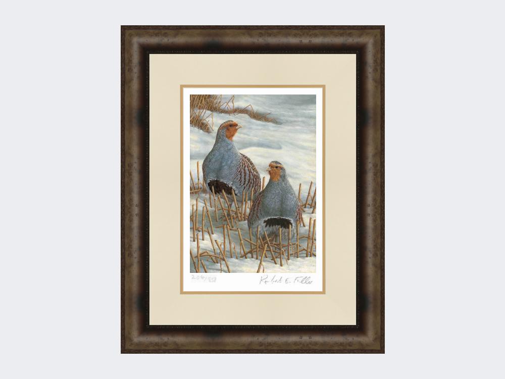 Cette superbe gravure montre une paire de perdrix grises dans un champ de chaume enneigé.