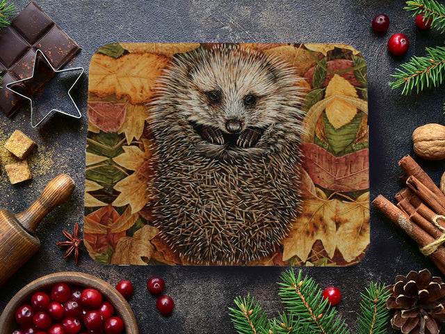 Ce magnifique plan de travail en verre trempé est orné d'un hérisson sur des feuilles d'automne. La qualité de l'impression est exceptionnelle et chaque détail des peintures de Robert Fuller a été fidèlement reproduit.